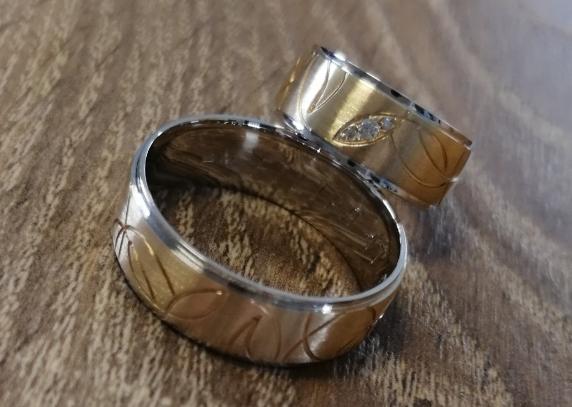 Aliança formato plano, em ouro bicolor de 19,2k, com 7mm de largura.