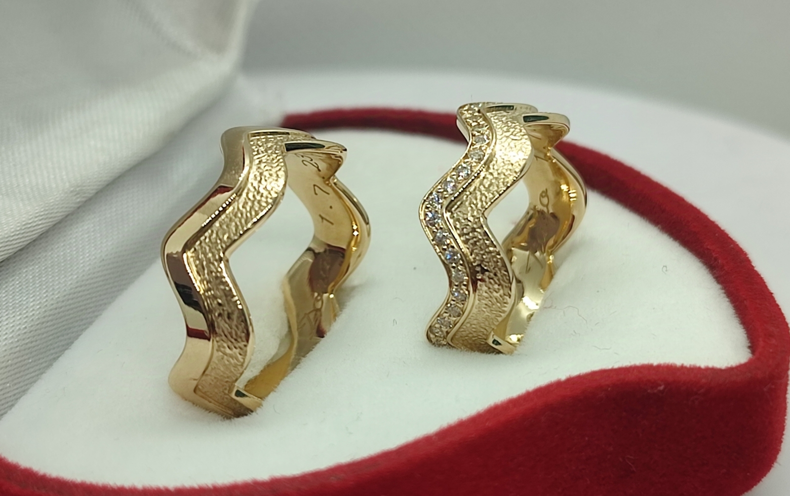 Aliança formato ondulado e plano, em ouro de 19,2k, com 7mm de largura.