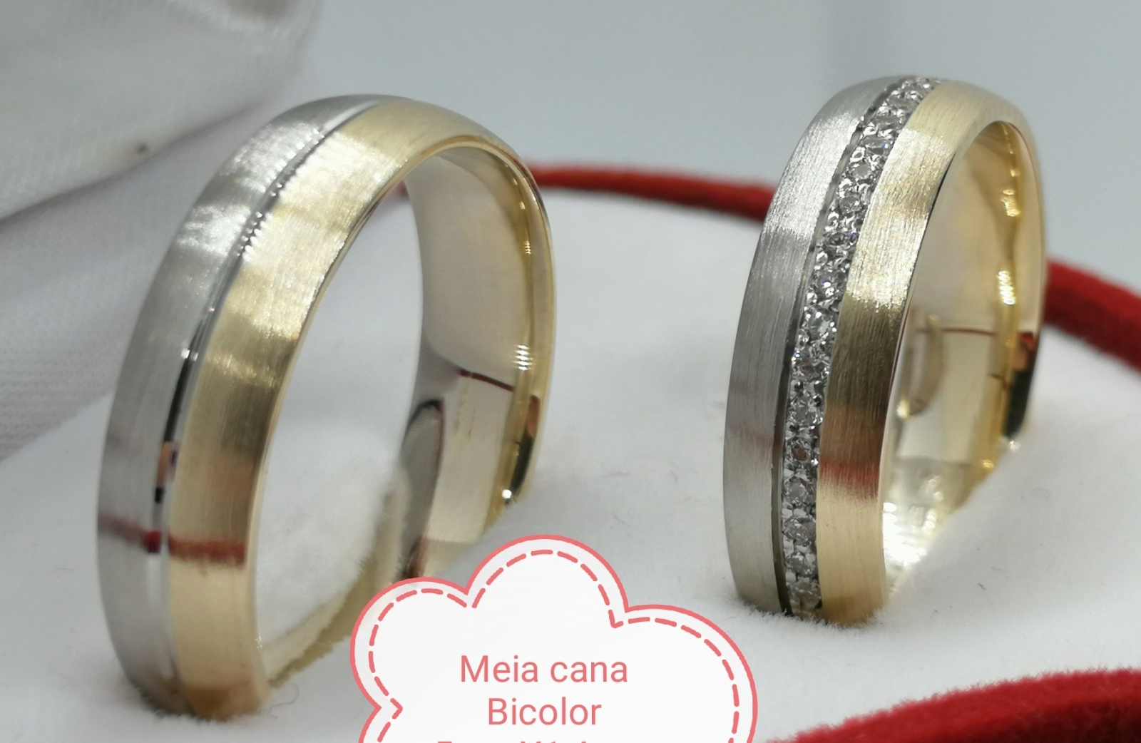 Aliança formato amêndoa, em ouro bicolor de 19,2k,