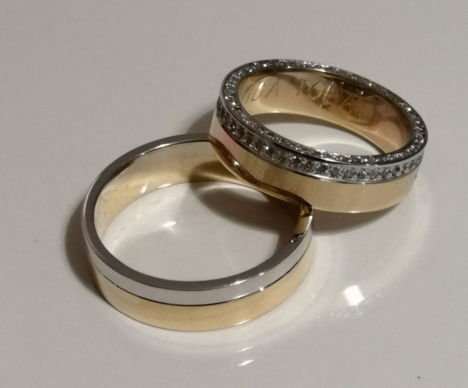 Aliança formato plano, em ouro bicolor de 19,2k,