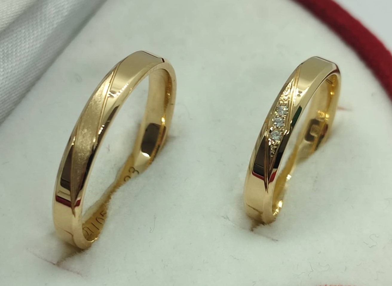 Aliança de Senhora com friso diagonal e 3 zircônias.